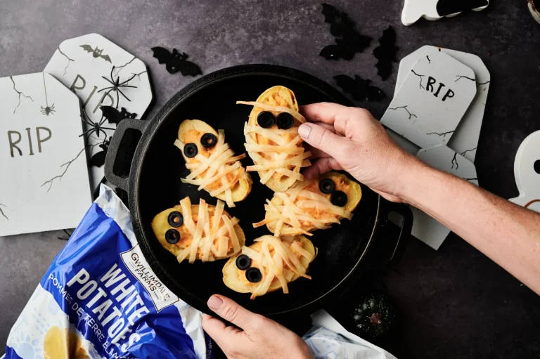 These spooky Potato Mummies are creepy-cute and totally delicious. Made with creamy mashed potatoes wrapped and accessorized with olive ‘eyes’ and veggie details, they’re a playful treat for any Halloween