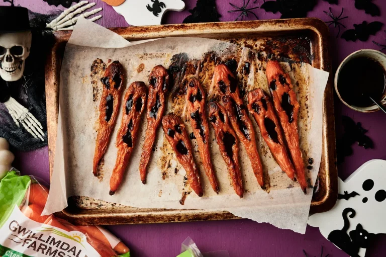 Our roasted carrots are dressed up for Halloween with spooky carved faces, then drizzled with a rich chocolate balsamic glaze. A playful twist that’s equal parts festive and delicious.