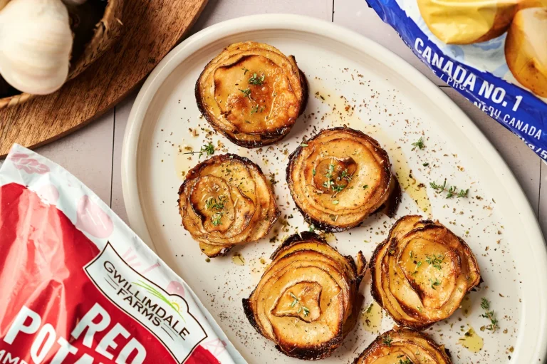 Baked rose-shaped potato gratins would be great for entertaining, since you can make them ahead, and keep them warm in the pan, or cool and reheat in the oven when