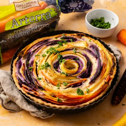 Line a tart pan with puff pastry. Starting from the center, roll and arrange the carrot ribbons in a spiral pattern, forming a rose.